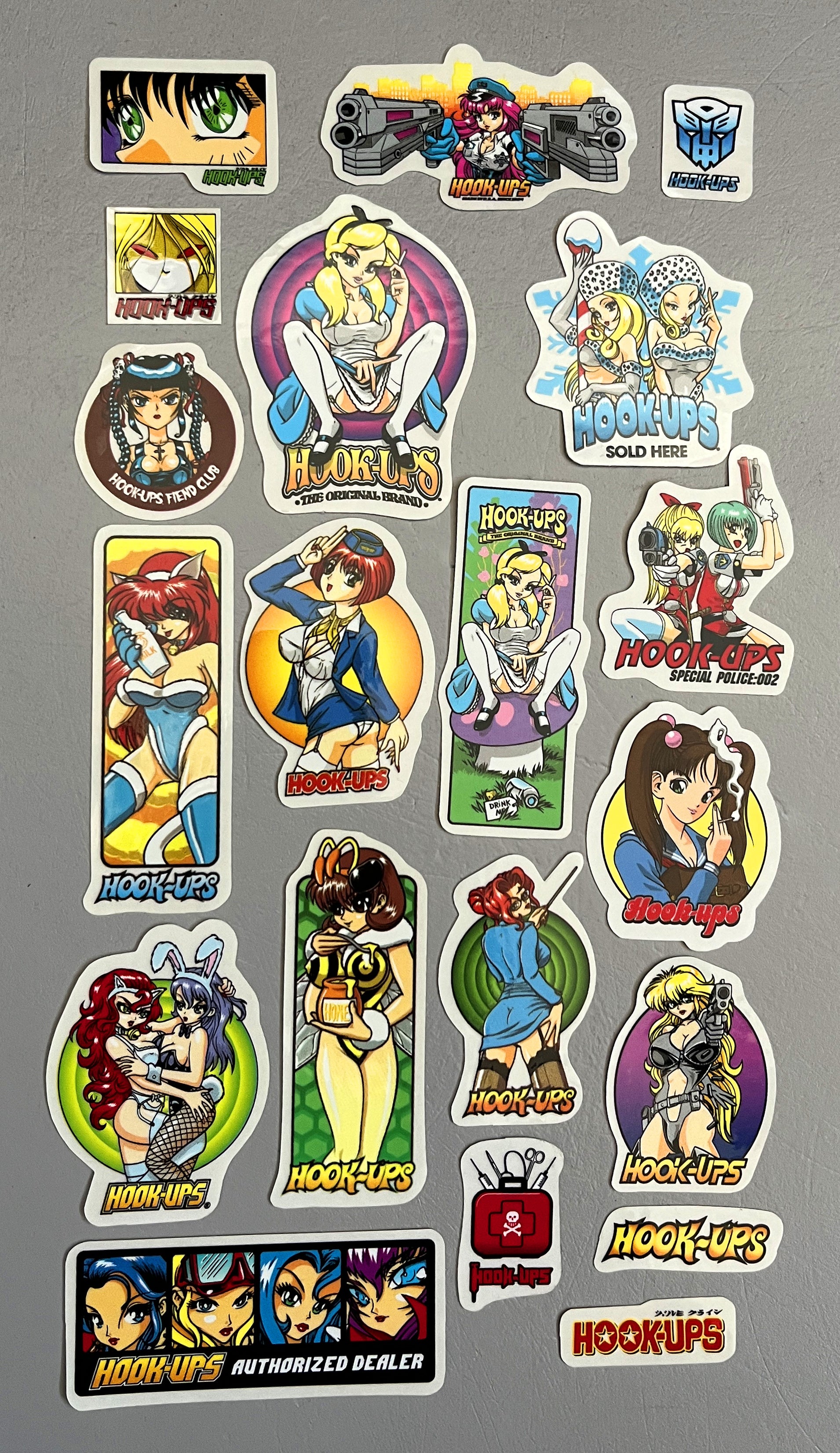 hook-ups mini size sticker pack #5 of 20 small stickers, 20 high quality screened stickers.